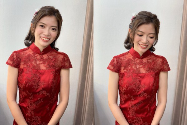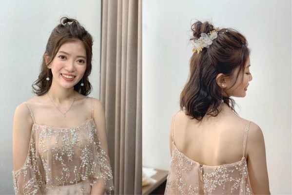 簡約的髮飾提升氣質感,有種畫龍點睛的效果。每個角度都會拍給新娘看,她說造型「零死角」啦~超級滿意又開心