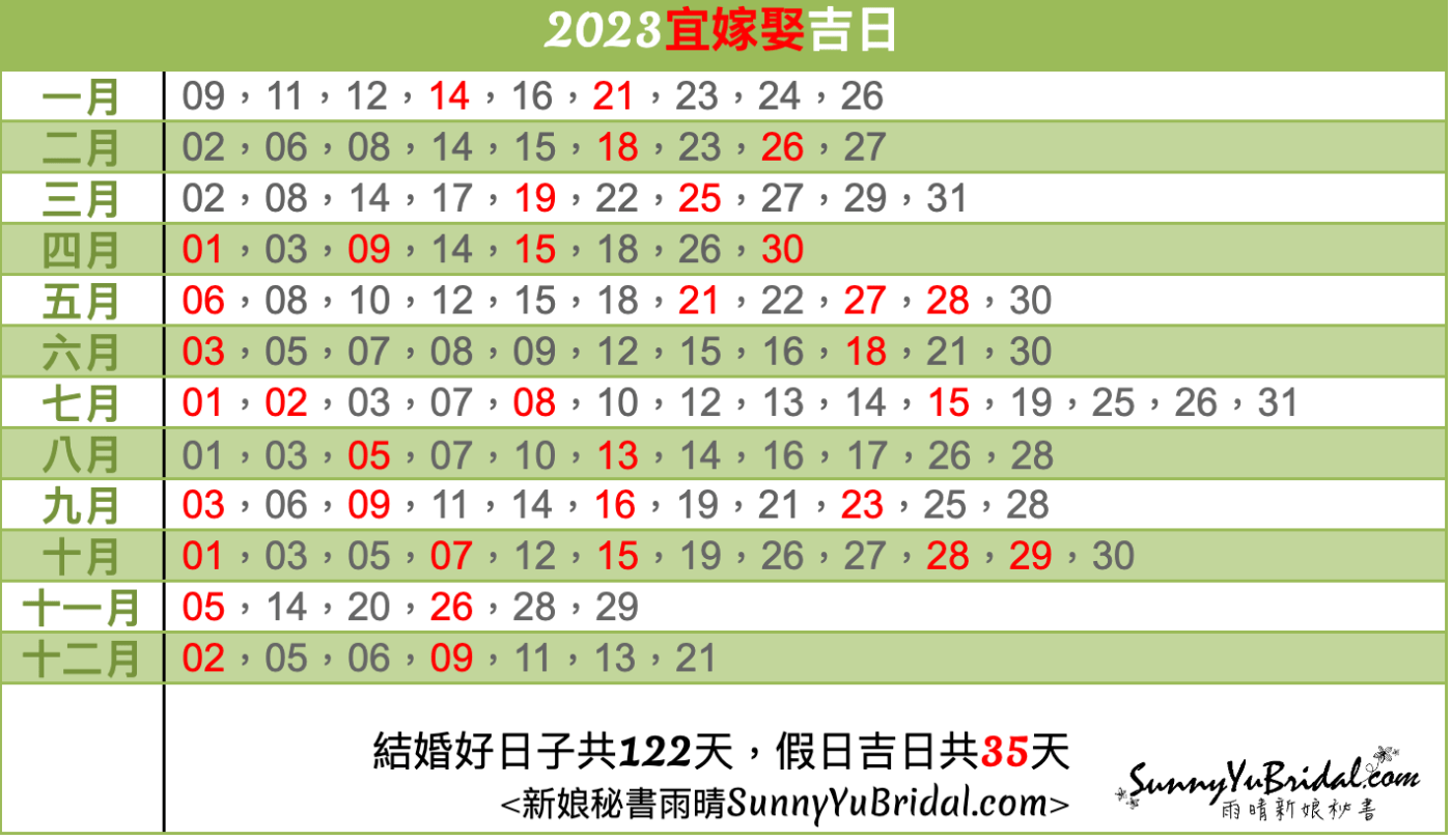 2023年婚禮好日子僅剩下122天,大家喜歡的假日好日子,也只有35天其實很少啊!所以,想結婚的新人們要加緊腳步啦~好日子是大家共用的,但喜歡的婚禮廠商一天只能服務一位新人,真的先搶先贏哦!