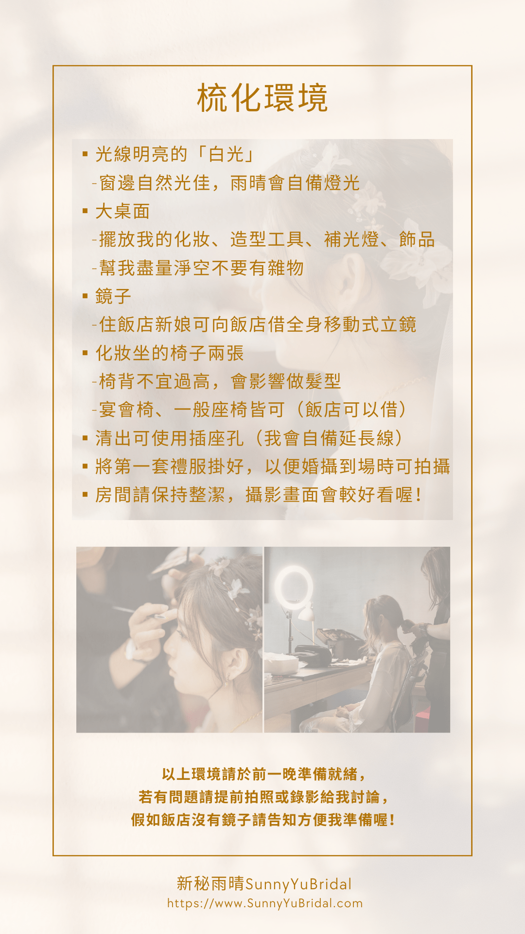 這裡雨晴幫大家準備了一週前、前一晚、當天早上、梳化環境的注意事項,