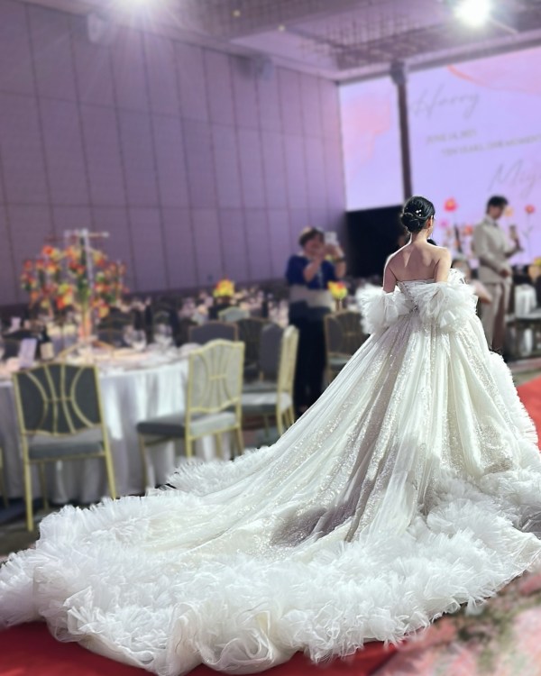 更能符合她挑選的浮誇婚紗,營造高級名媛感