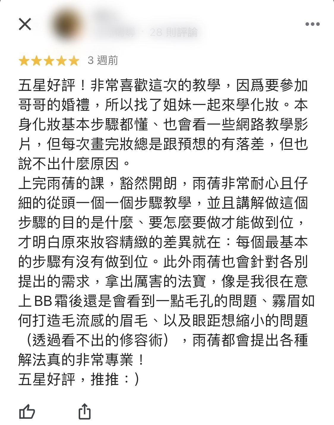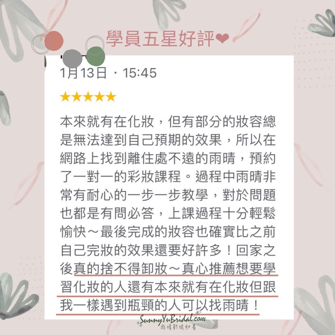 找對方法、學會技巧,日後持續練習就能把技術變成自己的,數百位女孩都來上過雨晴彩妝課了,上百則好評推薦,妳還等什麼?