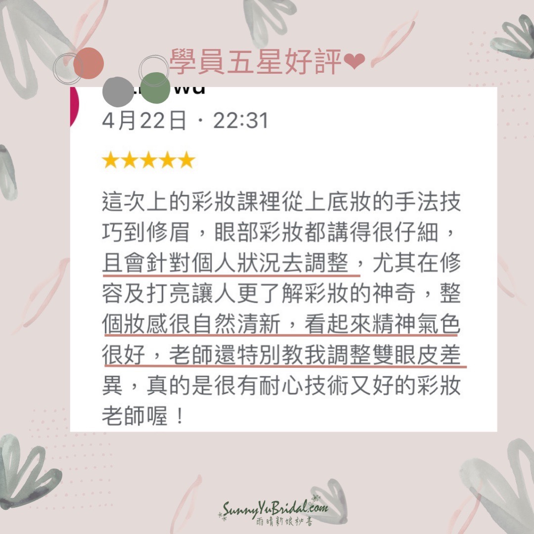 她說:「老師,你知道嗎?你是我第一個追蹤的新秘。默默看了你的作品很久,有一天參加朋友婚禮,發現新秘竟然就是妳!現場偷偷看了你很久,最近終於下定決心要來上彩妝課,今天謝謝你教我這麼多啊!」謝謝你遠從新竹搭車上台北上課啊!!