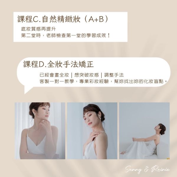 課程 C、自然精緻妝。合計兩堂/共4小時(為同時報名課程A+B)